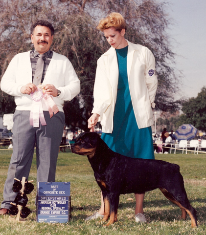 Achievements: over 100 titles achieved- American and Canadian Conformation Championships, Grand Championships, International Championships, Companion Dog, Companion Dog Excellent, Utility Dog, Utility Dog Excellent, Temperament Test Title, BH, Most Beautiful Female in Show, Siegerin, Youth Siegerin, Youth Sieger, V-1, Best of Breed, Best of Opposite Sex, VP-1, Best Female Puppy in Show, Tracking Dog, S.A.R., BISS, Multi Group Placements, Bronze and Silver producers, Number one, two, and three ranked females and number seven male and numerous top 20 Rottweilers in the United States.