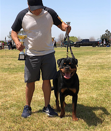Dama wins V-2 at 2018 RKNA Spring Sieger Show in Norco, CA under Judge Lew Olson at the Southern Sierra Rottweiler Club Sieger Show on Sunday 04/15/18. Handled by Nathaniel Gonzales.
